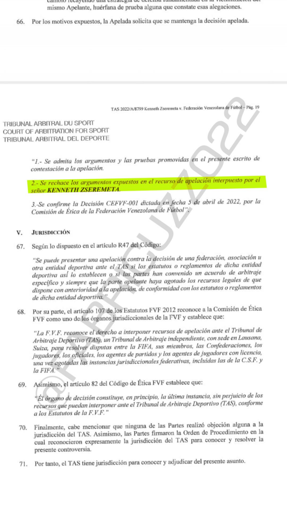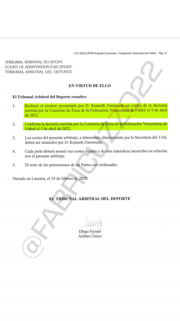 Pese a que el denunciado intentó minimizar los hechos en comunicaciones privadas, las pruebas presentadas ante tribunales ordinarios y deportivos han sido determinantes. Tanto la Federación Venezolana de Fútbol (FVF) como el TAS han ratificado su suspensión de toda actividad futbolística.